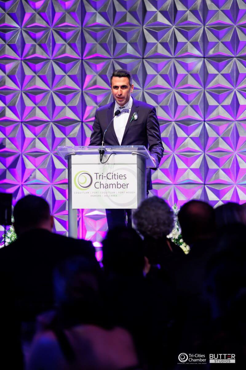 The Chamber received 100 nominations for its eight award categories. A volunteer panel of 10 judges selected three finalists for each award, with the recipients announced at the gala. For the ninth award, Ryan Whittle, Past Chair of the Chamber's Board of Directors bestowed the Chamber Member of the Year to Navid Morawej. The event was emceed by Paul Haysom, Global BC Morning News Anchor, and presented by Douglas College.